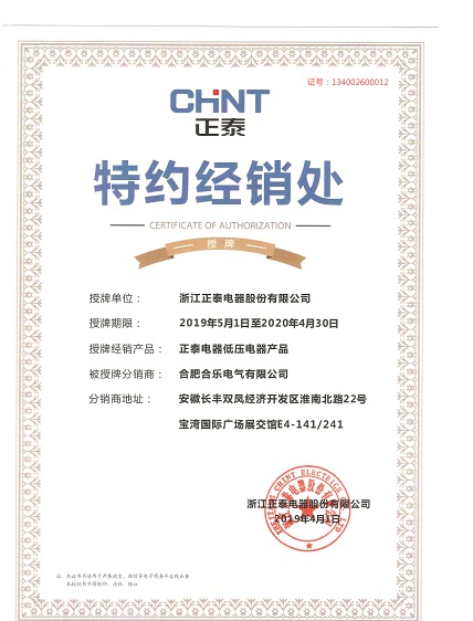 2019年浙江正泰電器股份有限公司授權(quán)合肥合樂電氣有限公司為正泰低壓電器產(chǎn)品特約經(jīng)銷處