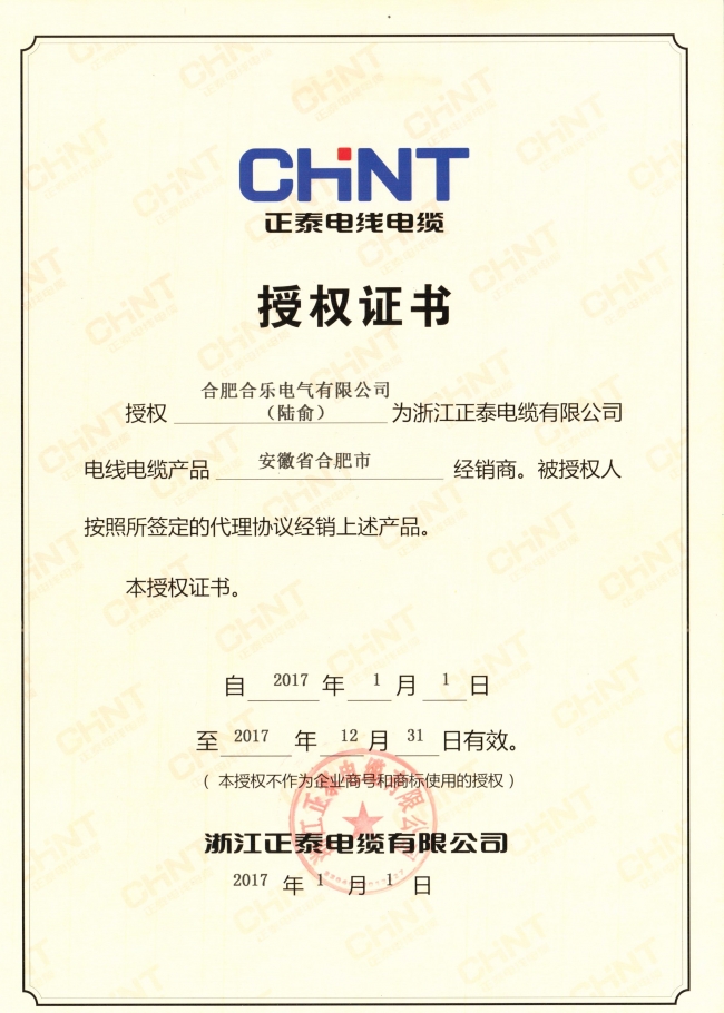 浙江正泰電纜有限公司授權(quán)合肥合樂電氣有限公司為合肥市電線電纜產(chǎn)品特約經(jīng)銷商